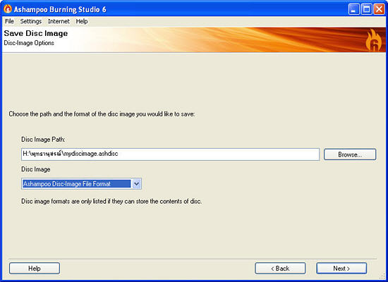 ในช่อง Disc Image เลือกรูปแบบของไฟล์ที่ต้องการ แล้วคลิกปุ่ม Next
