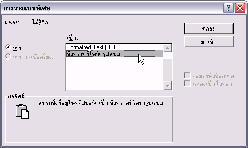 แล้วเลือกรูปแบบการวางเป็น "ข้อความที่ไม่จัดรูปแบบ" แล้วกดปุ่ม "ตกลง"
