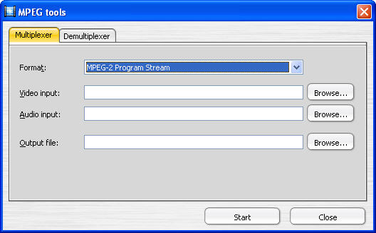 เปิดหน้าต่างหลักของโปรแกรม (Start) คลิกปุ่ม MPEG tools แล้วคลิกแท็บ Multiplexer ช่อง Format เลือกรูปแบบของวีดีโอ ช่อง Video input คลิกปุ่ม Browse เพื่อเลือกไฟล์ภาพ