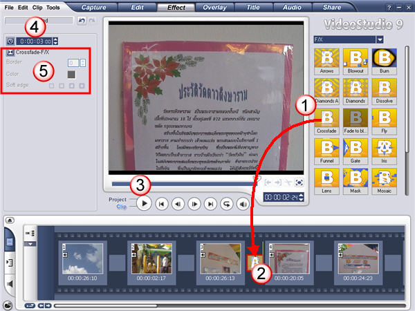 การใส่เอฟเฟ็กต์ คลิกบนรายการเอฟเฟ็กต์ที่ต้องการ (1) แล้วลากมาวางในระหว่างคลิปวีดีโอ (2) คลิกปุ่ม Play (3) เพื่อทดสอบเอฟเฟ็กต์ดูว่าผลได้ตามความต้องการหรือไม่ หากรู้สึกว่าช่วงเวลาแสดงเอฟเฟ็กต์นั้นสั้นหรือนานไป ให้ไปกำหนดระยะเวลาของเอฟเฟ็กต์ (4) เอฟเฟ็กต์บางรายการสามารถปรับแต่งรูปแบบได้ (5) อย่างเช่น เลื่อนภาพจากซ้ายไปขวา จากด้านบนลงด้านล่าง เป็นต้น