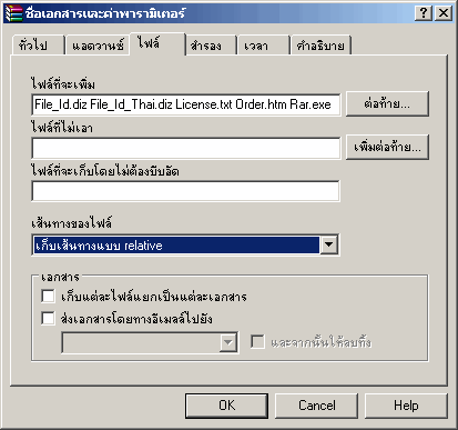 หากต้องการเพิ่มเติมไฟล์ที่จะบีบอัดอีก หรือตั้งค่าตัวเลือกเกี่ยวกับไฟล์ ให้คลิกแท็บไฟล์ แล้วคลิกปุ่ม "ต่อท้าย" ในช่องไฟล์ที่จะเพิ่ม เลือกไฟล์ที่จะเพิ่มเติมจากไฟล์ที่ได้เลือกไว้อยู่แล้ว