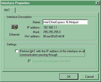คลิกที่รายการ RAS (ส่วนติดต่อไปยังอินเทอร์เน็ตเช่น Dial-Up ติดต่ออินเทอร์เน็ตผ่านโมเด็ม) แล้วกดปุ่ม Properties หรือ ดับเบิ้ลคลิกที่รายการ RAS ที่แท็บ NAT ในช่อง Name อาจจะเปลี่ยนชื่อเป็นชื่อของ ISP ก็ได้เพื่อที่จะจำได้ง่ายขึ้นในกรณีที่มีการใช้บริการของ ISP หลายแห่ง ให้ทำเครื่องหมายถูกหน้า "Perform NAT with the IP address ..." (โดยปกติจะมีเครื่องหมายถูก) ไม่ต้องทำเครื่องหมายถูกหน้า "Exclude this computer from NAT"