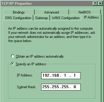 ที่แท็บ IP Address เลือก Specify an IP address ที่ช่อง IP Address ป้อนหมายเลข IP ชั้น Private เช่น 192.168.1.1 ใน Subnet Mask ป้อน 255.255.255.0 (หากต้องการทราบข้อมูลเพิ่มเติมเกี่ยวกับหมายเลข IP ชั้น Private และ Subnet Mask โปรดศึกษาเพิ่มเติมจากหนังสือเกี่ยวกับ Network หรือหนังสืออื่นๆ ที่เกี่ยวข้อง)